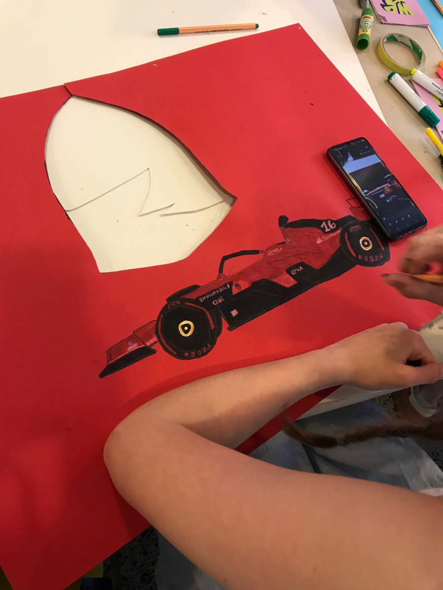 Zeichnung eines Rennautos auf rotem Tonpapier